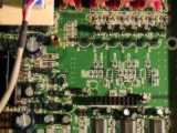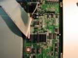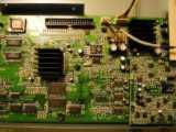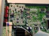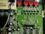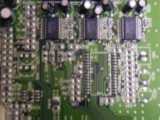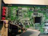 Zoom sur la carte mère. Réalisée en double face, on note la présence de circuits Nec, Sharp, Philips exclusivement à base de composants SMS (Composants à montages en surfaces). Le lecteur utilise un chip ES4308 pour la vidéo (la grosse chose avec le radiateur) et le décodage MP3. Le décodage MP3 doit être fait avec le logiciel DSP tournant dans le chip ES4308. Devant en bas à gauche, on trouve la mémoire flash (seul composant interchangeable) pour la mise à jour. C'est un petit composant à 32 pattes (composant avec un support marron) portant l'indication FBQ0XFPX3C ou autre. Les puces manquantes sur la photo (en haut à droite) sont pour le décodeur AC3 sur le modéle AV713. On distingue les places aménagées pour un décodeur digital et dts. On notera aussi des sérigraphies Y-Pr-Pb pour une sortie vidéo composante optionnelle.