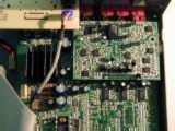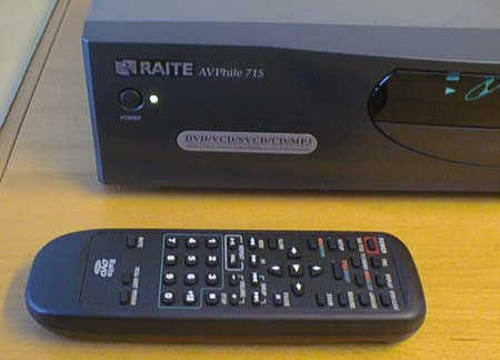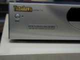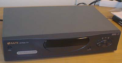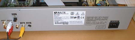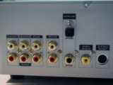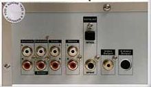 Le panneau arrière (aluminium). Les connecteurs de gauche à droite sont : Audio 1 et 2 , sortie digitale (optical et coaxial), sortie vidéo composite, sortie SVHS, et alimentation secteur. Le modéle AV713 a trois paires de sortie audio pour le décodeur AC3