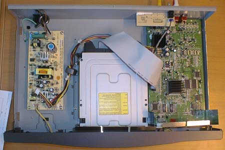 A l'intérieur : l'alimentation, le mécanisme DVD et la carte mère. La visite interne ne révéler que du trés bon avec des composants de premier ordre. A gauche, la carte d'alimentation est dotée d'une adaptation automatique permettant de passer indifféremment de 100 à 230V (pas de commutateur). Cette carte fournit l'alimentation en +3.5/-3.5V à la carte clavier afficheur placée derrière la façade de l'appareil. Au centre, si vous regarder de plus prés, vous vous apercevrez que le lecteur DVD est un lecteur DVDROM PC avec une nappe IDE ATAPI (nappe informatique) qui le relie à la carte. Il est à remarquer l’excellente fixation du lecteur de DVD dans le boîtier ce qui explique l’absence de vibration et de bruit parasite pendant la lecture. Le Tokai ne possède pas de ventilateur interne entraînant parfois une chaleur excessive à l'intérieur du boîtier. Certains bidouilleurs optent pour le rajout d'un ventilateur. On trouve plusieurs lecteurs : des RAITE RDR-105 (Raite fabrique aussi des lecteurs DVD Rom) bien sur mais aussi des PHILIPS PCA424D, des HITACHI GD2500 4/24x , des Panasonic SR-8584 6/32X (Matsuchita). Ces derniers posent certains problèmes (bruits d'aspirateur en lecture MP3). Avec ce type de dvd-rom, ce lecteur apparaît comme le lecteur le plus rapide du marché. Des essais de remplacement du lecteur d'origine par un lecteur Créative DRX2 a été essayé par des Allemands, avec succès (sauf au niveau des fixations). La platine mécanique est parfaitement silencieuse sans bruit de moteur comme c’est parfois le cas sur les lecteurs de PC. La platine Dvd Rom est dotée d'une sortie audio stéréo non exploitée. A droite de l'appareil, la carte mère (sérigraphiée de la signature de la société taiwanaise Kuoting) occupe 13x25 cm.